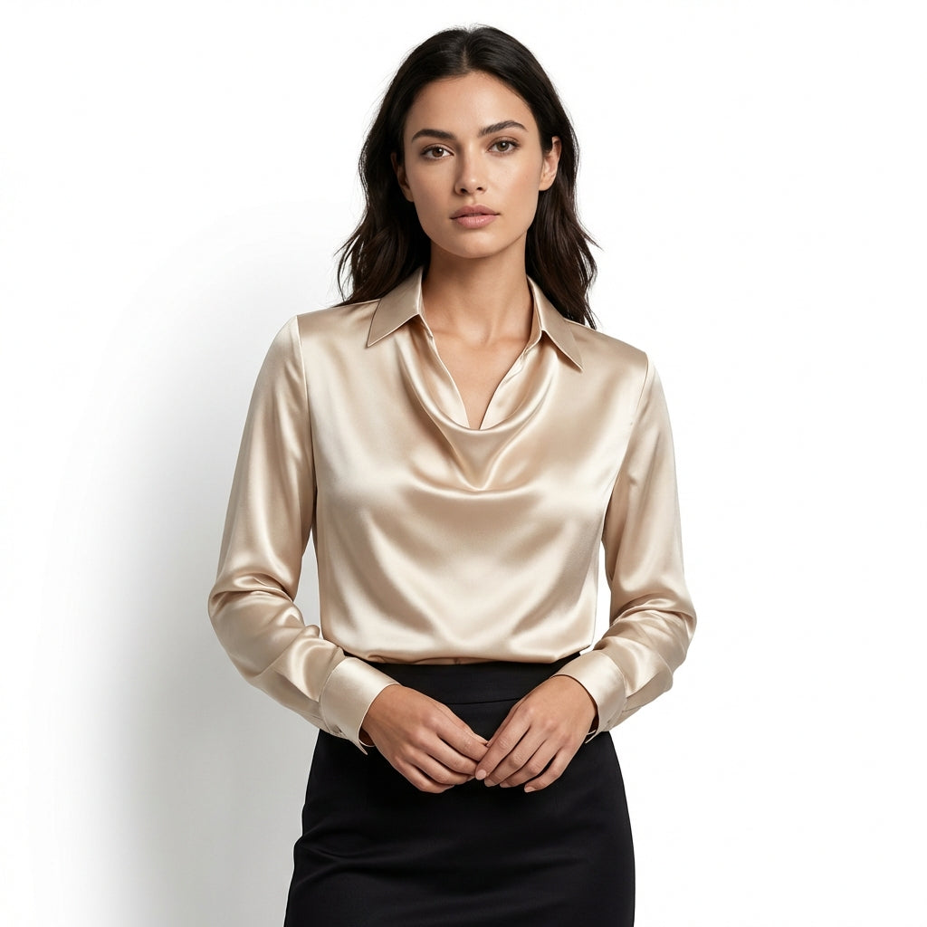 The smooth satin finish enhances the natural drape of the fabric, while the long sleeves provide a polished and versatile look. Suitable for professional settings, formal occasions, and elevated everyday styling, this blouse blends sophistication with understated elegance.